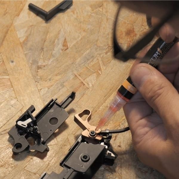 また、浸透性があるため、狭い隙間にも到達し、メンテナンス時にはトリガーグループを分解しなくても、 少量の注油だけで、各摩擦面に保護層を作ることが可能です。